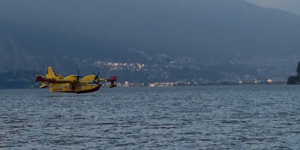 Ieri e oggi Canadair ancora in azione nel Verbano e nella Bassa Ossola per domare due incendi boschivi divampati nelle alture sopra Premosello Chiovenda l’uno, e l’altro sopra Gurrone, in valle Cannobina. Nella foto un rifornimento di un Canadair nelle acque antistanti Cannobio, il rogo in Cannobina oggi appare sotto controllo.